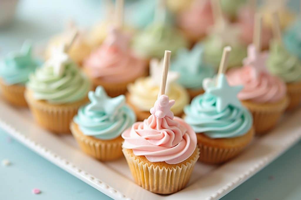 - Cupcakes mit Baby-Thema: Kleine Küchlein sind vielseitig. Verziere sie mit blauen oder rosa Frostings, kleinen Babyschuhen aus Fondant oder Zuckerguss-Saugern. Beliebte Geschmacksrichtungen sind Vanille, Zitrone oder Schokolade.
