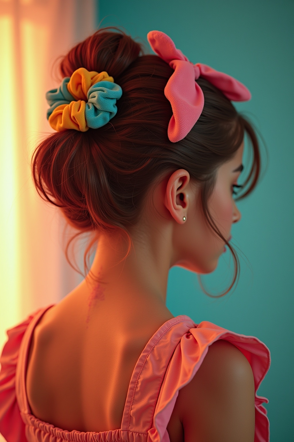 - Scrunchies in knalligen Farben oder Samtoptik sind absolute Must-haves für 90er Frisuren
