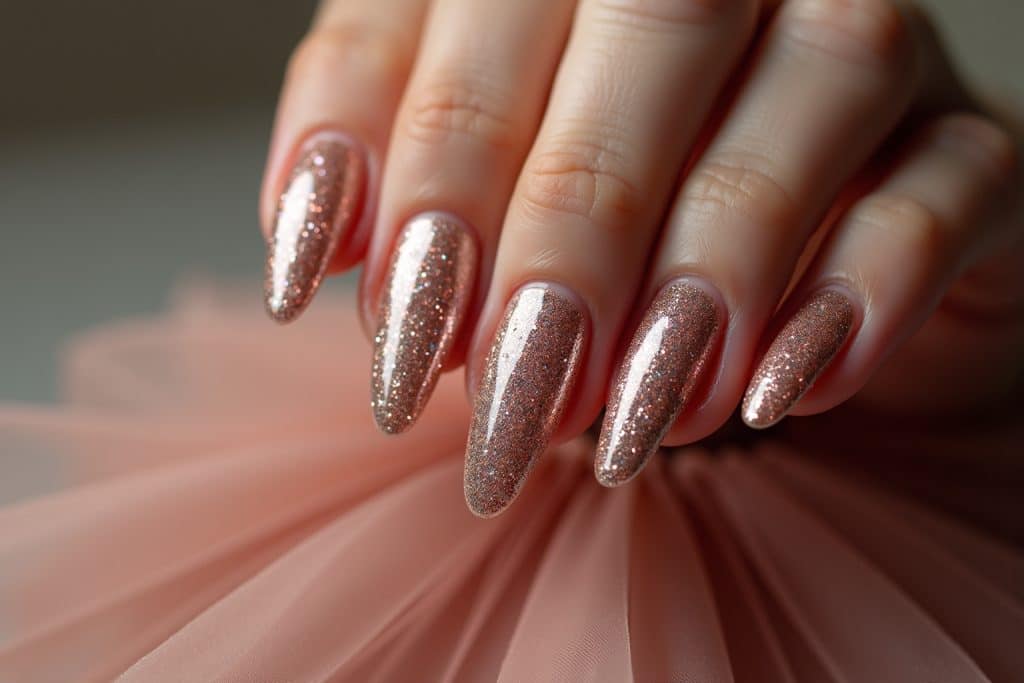 Kein Silvester ohne Glitzer! Für Ballerina-Nägel kannst du einen Vollglitzer-Look wählen, bei dem jeder Nagel mit feinem oder grobem Glitzer überzogen ist. Beliebte Farben sind Silber, Gold, Roségold und tiefes Schwarz. Alternativ kannst du einen „Ombré-Glitzer“ kreieren, bei dem der Glitzer vom Nagelbett zur Spitze hin intensiver wird. Eine weitere Option ist ein dezenter Glitzerakzent auf einem oder zwei Fingern, während die anderen Nägel in einer eleganten Basisfarbe gehalten sind.