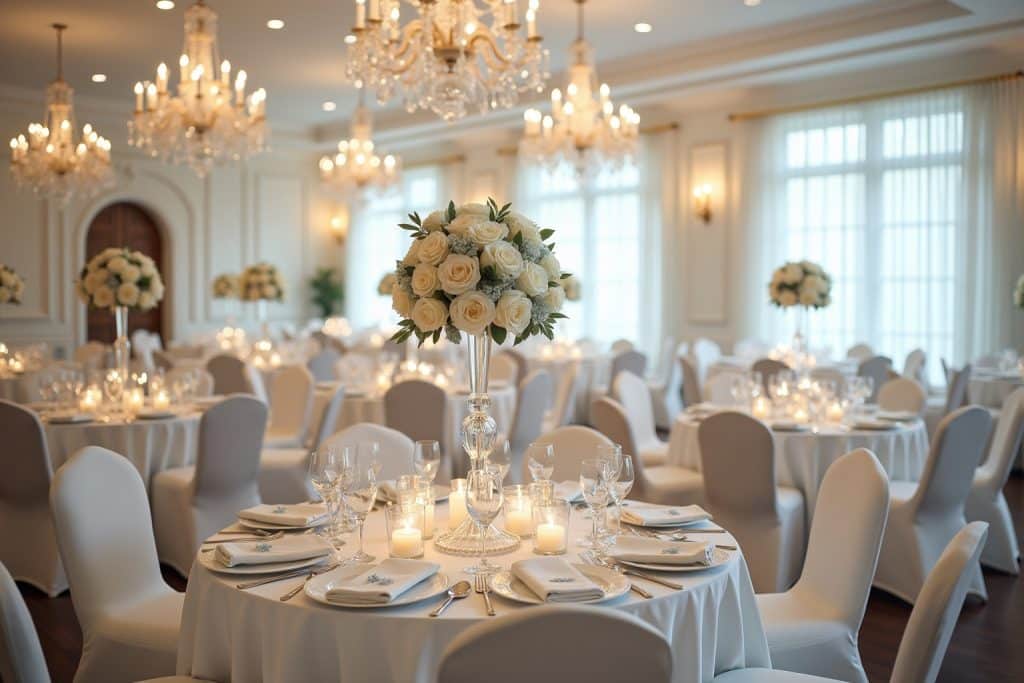 | Raumgestaltung | Weiße Stoffdrapierungen, Lichterketten, weiße Möbelbezüge, große weiße Akzente (Skulpturen, Vasen) | Erschafft ein einheitliches, luxuriöses Ambiente und lenkt den Blick | Konsequente Farbgebung, vertikale Elemente zur Raumwirkung, gezielte Akzente |